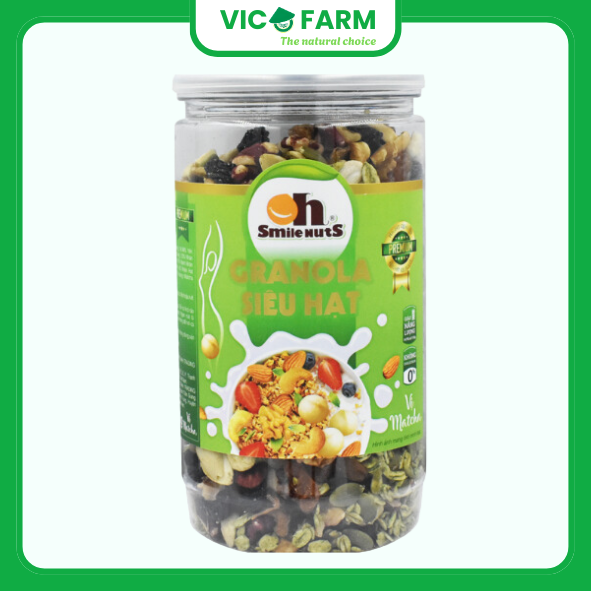 Granola Siêu hạt gồm các loại hạt và yến mạch được nướng giòn. Loại này khá dễ ăn nên phù hợp cho những ai mới bắt đầu tập ăn. Hơn nữa Granola Vị Matcha giúp gia tăng hương vị chắc chắn sẽ hợp khẩu vị của đa số người tiêu dùng, đặc biệt là trẻ em. Đây là món ăn được sử dụng phổ biến để cung cấp nguồn năng lượng dồi dào cho cơ thể trong ngày làm việc mới.